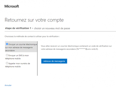 6. Par défaut, l'option d'un envoi de mail est sélectionnée. Cliquer sur Adresse de messagerie pour qu'un email soit envoyé sur votre adresse électronique Universitaire. Vous recevrez un courriel provenant de msonlineservicesteam@microsoftonline.com