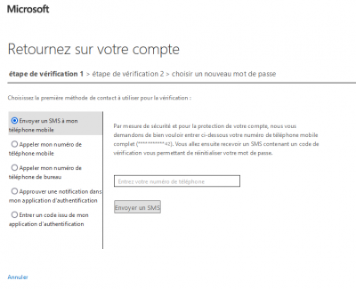 o Si vous suivez cette procédure dans le cadre d'une réinitialisation de mot de passe et dans le cas où des méthodes de double authentification sont paramétrées, différentes options vous sont proposées pour récupérer un accès à votre compte et modifier le mot de passe de celui-ci.