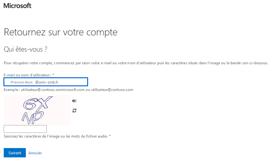 Si à l'une des étapes de cette documentation, un message d'erreur des services Microsoft s'affiche et vous empêche de poursuivre la procédure, vous pouvez nous contacter à l'adresse électronique aide-dn@univ-smb.fr en nous joignant une copie d'écran de l'erreur rencontrée.