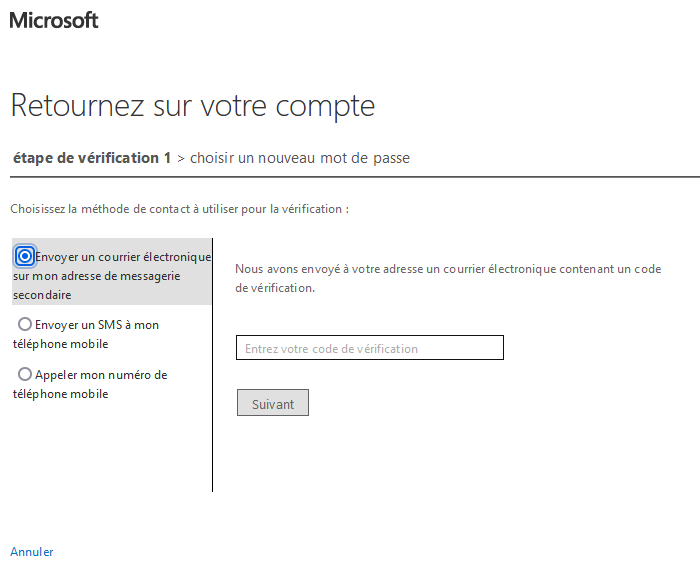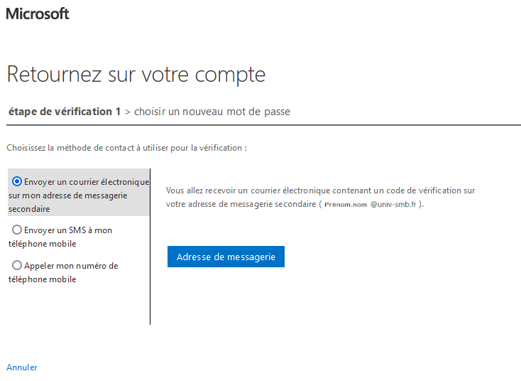 6. Par défaut, l'option d'un envoi de mail est sélectionnée. Cliquer sur Adresse de messagerie pour qu'un email soit envoyé sur votre adresse électronique Universitaire. Vous recevrez un courriel provenant de msonlineservicesteam@microsoftonline.com