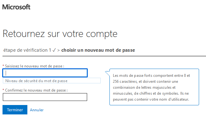 8. Créez votre nouveau mot de passe qui vous servira pour l'utilisation des services Microsoft.